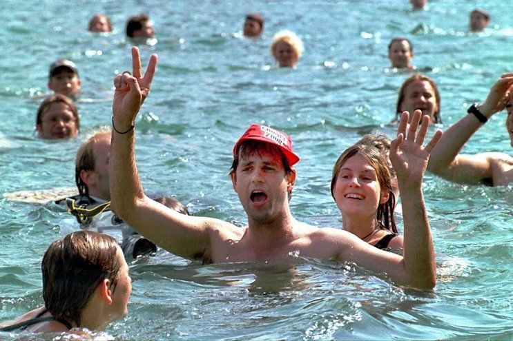 Das Bild zeigt Christoph Schlingensief bei einer seiner schönsten Aktionen der zur Bundestagswahl 1998 gegründeten Partei Chance 2000, dem Bad im Wolfgangsee am 2. August 1998. Chance 2000 lud seinerzeit sämtliche Arbeitslose der Republik ein, im österreichischen Wolfgangsee zu baden, um das Urlaubsdomizil des deutschen Kanzlers zu fluten.
