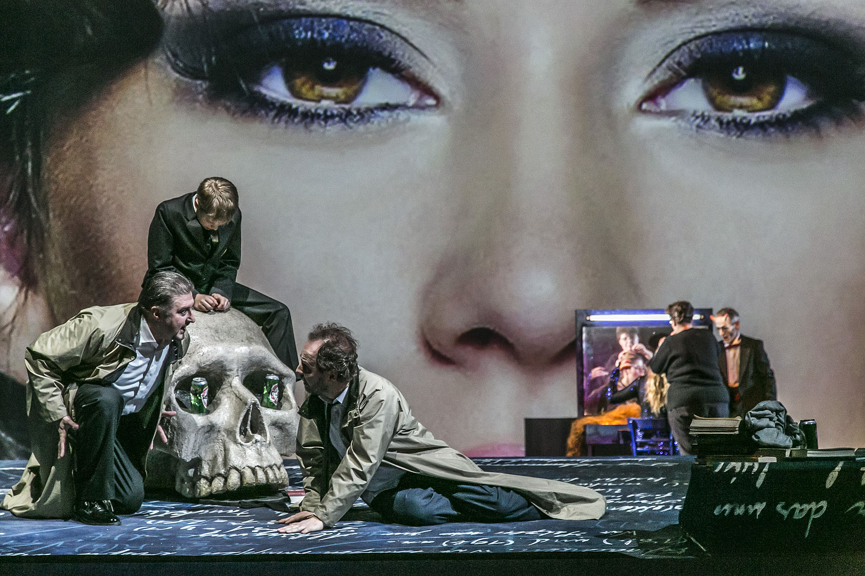 Links noch ein hüfthoher Schädel, in den Augenhöhlen zwei Bierdosen, die im Bühnenlicht funkeln – das prototypische Vanitas-Symbol, jener barocken Darstellungsform der Unzulänglichkeit menschlichen, weil irdischen Strebens. Es ist das Generalthema dieser Umsetzung und bleibt über den ganzen Abend auf der Bühne von Stefan Heinrichs präsent.