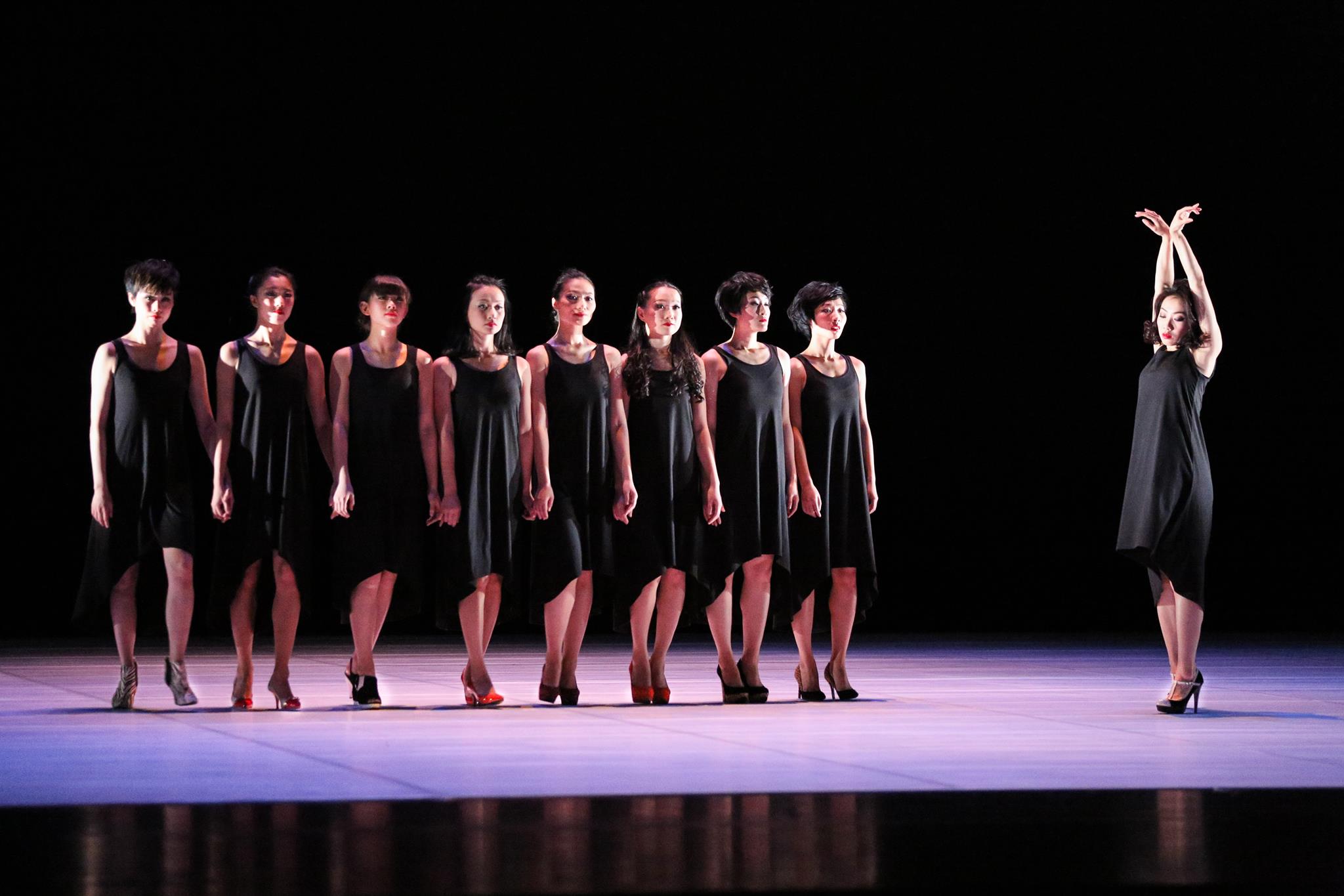Frau-Sein und der Umgang mit dem eigenen Geschlecht ist auch Thema ihres Stückes, das den Auftakt des dreiteiligen Abends auf Kampnagel macht. Neun Tänzerinnen erscheinen in schlichten schwarzen Kleidern auf der Bühne. Sie sind barfuß. Am vorderen Bühnenrand warten neun Paar hochhackige Schuhe nebeneinander auf ihre Besitzerinnen. High Heels als Symbol für Weiblichkeit, Selbstbewusstsein und Macht? Ist eine Frau erst schön, wenn sie ihrem Geschlecht und ihrem Dasein durch hohe Absätze Glanz verleiht?