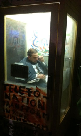 Schauspieler Daniel Lommatzsch schwitzt. Er steckt in einer Telefonzelle im Seitenfoyer des Thalia Theaters, und als wäre das nicht schon beengend genug, hat man ihn in einen Fatsuit gepackt. Warum, wird nicht klar, aber das macht ja nichts. Lommatzsch hat Telefondienst. Sein Job besteht darin, zufällig Nummern aus dem Telefonbuch zu suchen und die Menschen, die er erreicht, dazu zu bewegen, die Informationen aus den Nachrichten in Energie umzuwandeln.