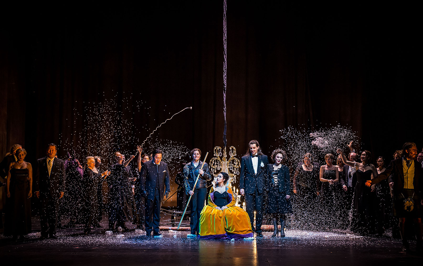 So ist man denn schnell beim Happy Ending, der Schurke vernichtet am Boden und das Paar glücklich vereint – so will es die zu erwartende Vorgabe. Doch der Regisseur greift vor und nimm das Artifizielle, den zukünftigen aufklärerischen Moment beim Wort. Ganz wie die Paare ein halbes Jahrhundert später – im Labor der Liebenden der Così – will dann doch nicht die Freude des glücklichen Endes auftauchen. Die ge- und enttäuschte Ginevra ist gefangen in der Erwartung des kommenden »Glücks«, der glitzernde Kronleuchter des Palastes (Ausstattung: Pierre Albert), in dem sie die künftige Herrscherin sein wird, hat sie fast erdrückt und ihre Blicke sind ob all des formalisierten Jubels mehr als zweifelnd. Wir wissen nun, es gibt keine rote Rosen für sie und in der Oper ist alles Schein. In der Moderne tritt die Form hinter das Individuum zurück, nicht übel für ein 282 Jahre altes Stück.